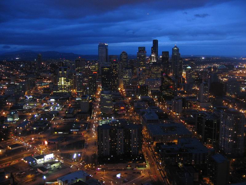 Gegen 13 Uhr sind wir endlich in Seattle angekommen. Und seltsamerweise hat es zu dem Zeitpunkt nicht geregnet. Im Gegenteil, es war sogar sonnig. Seattle ist eigentlich eine richtig schöne Stadt. Schöne Hochhäuser, saubere Straßen und kaum Penner. Erinnert mit irgendwie an Chicago, obwohl die Stadt an den großen Seen noch wesentlich schöner ist. Und vor allem gibt es in Chicago einiges zu sehen. Es mag daran liegen, dass ich nicht wirklich vorbereitet war, aber irgendwie gibt es in Seattle außer der Space Needle nicht viel zu sehen. Wir sind also recht ziellos durch die Gegend gelaufen und haben dummerweise keinen Platz gefunden, von dem aus man Mount Rainer sehen kann. Als wir schließlich auf die Space Needle gefahren sind, war es schon zu dunkel um noch irgendwas zu sehen. Aber wahrscheinlich wäre es eh zu nebelig gewesen um etwas erkennen zu können.